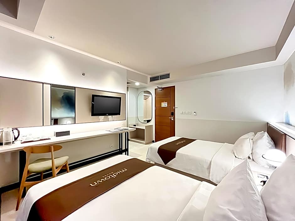 Modern twin room with a flat-screen TV, personal safe and tea/coffee-making facilities.